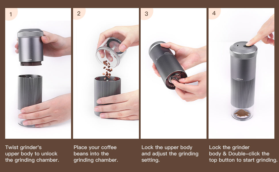 - Pour the coffee beans into the chamber,then Flatten the coffee beans well(Max 15g; Please do not exceed 15g, please be sure to press the coffee beans flat, otherwise the motor will be blocked and doesnt work.)
