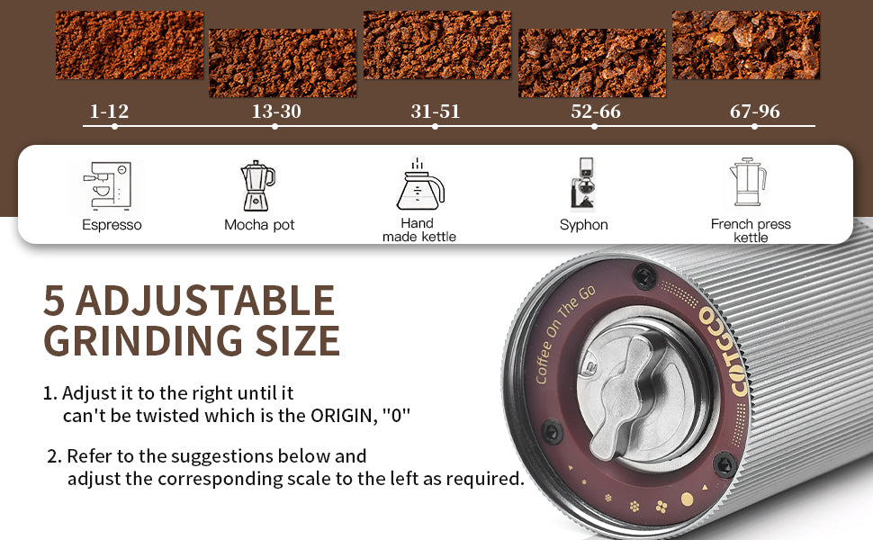 Adjust the grinding setting compass clockwise to the end.That's the original “0”.Then adjust counterclockwise to set your grind size.