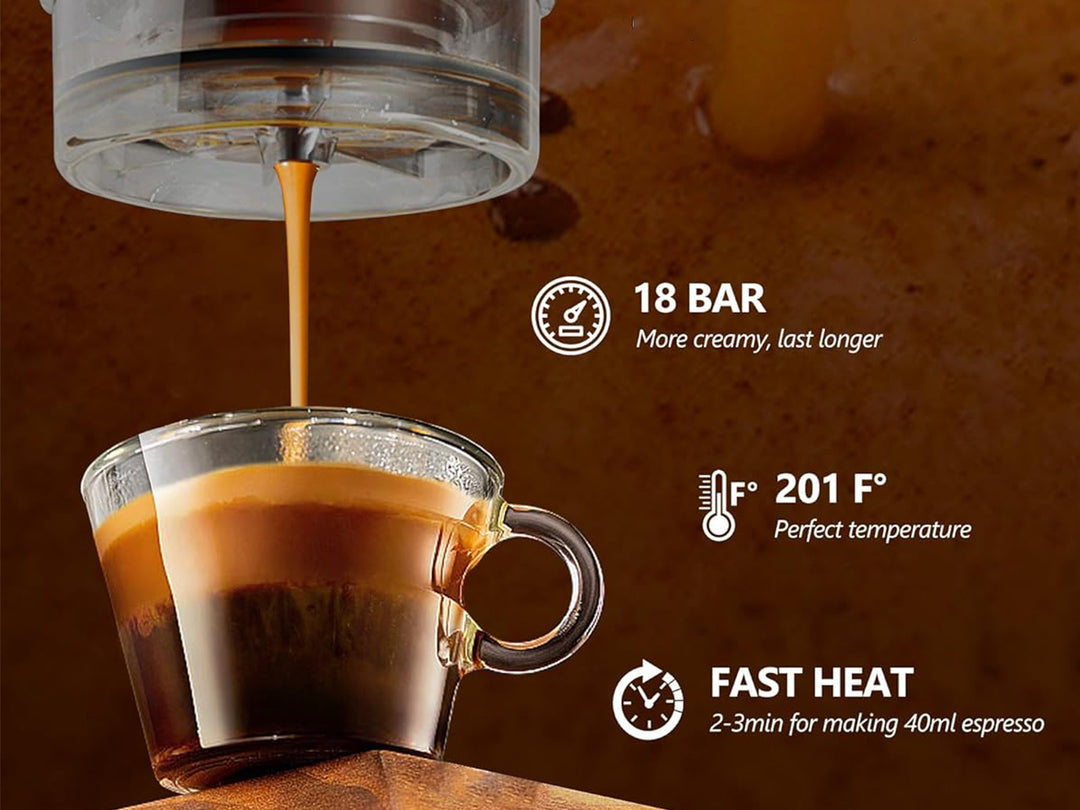 - 15 bars pressure keeps the capsule/ground coffee extracted perfectly and ensures the espresso with rich crema and aroma.